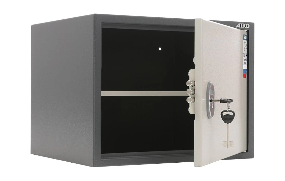 Шкаф Aiko SL-32 – это прочное сварное изделие из стальных листов толщиной 1.2 мм. На дверь устанавливается трёхригельный ключевой замок «Практик» сувальдного типа.